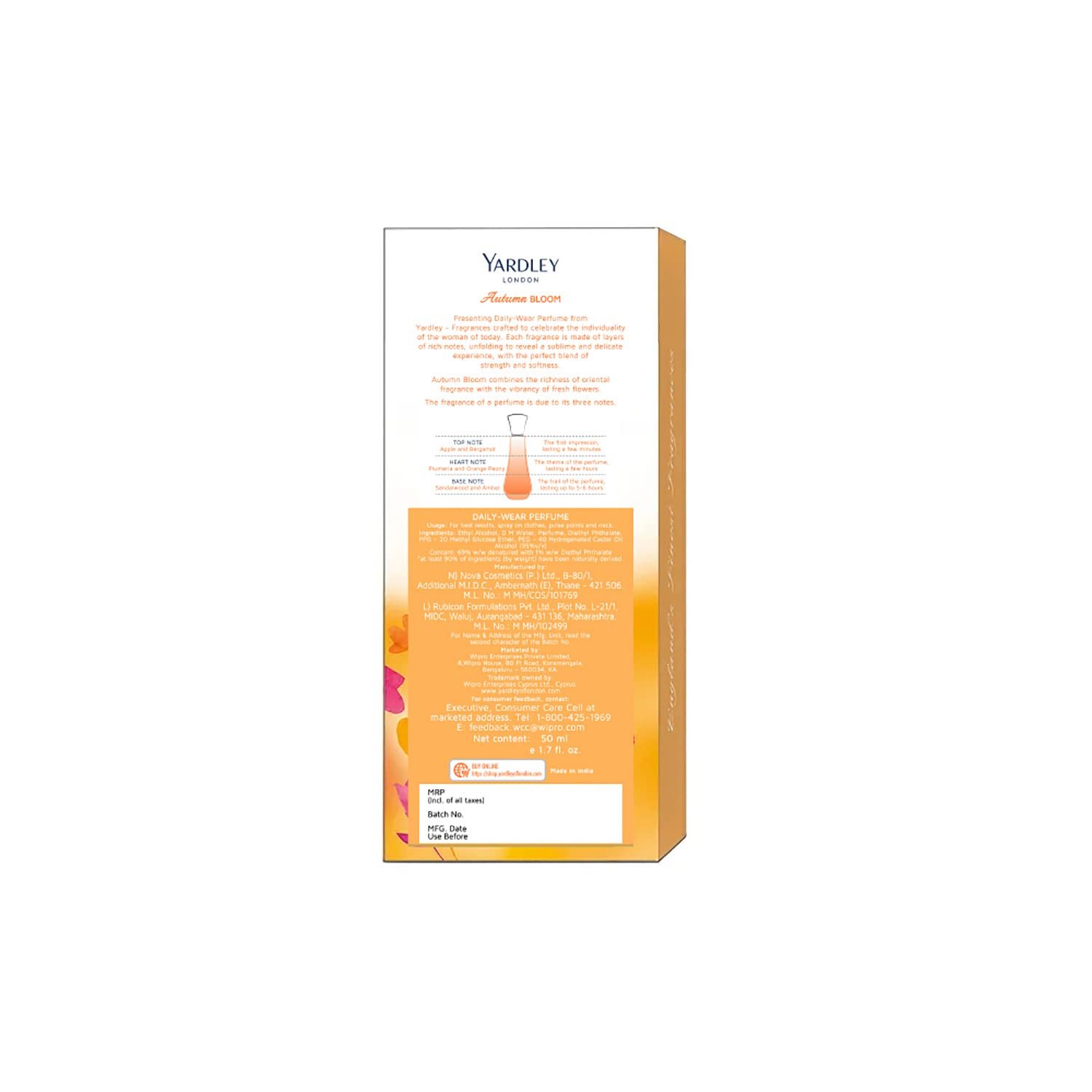 Yardley London Autumn Bloom Daily Wear Perfume is a sweet and sensual oriental fragrance inspired by the crisp, colorful autumn season in Britain. It opens with a fresh zest of apple and bergamot, leading into a heart of delicate rose and apple blossom. The fragrance is rounded off with warm notes of amber and sandalwood, creating a balanced and inviting scent. Perfect for daily wear, this perfume offers a harmonious mix of fruity and floral elements with a touch of oriental richness, making it suitable for any occasion. Made in India, it embodies elegance and freshness in a 50ml Eau de Parfum bottle.