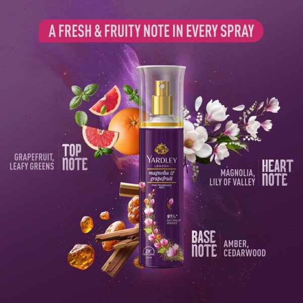 Infuse your everyday with a burst of cheerful freshness and floral charm. The Magnolia & Grapefruit Fine Fragrance Mist from Yardley London offers a modern, uplifting scent profile that blends juicy citrus notes with delicate blossoms — ideal for those who want a light and playful yet refined fragrance.