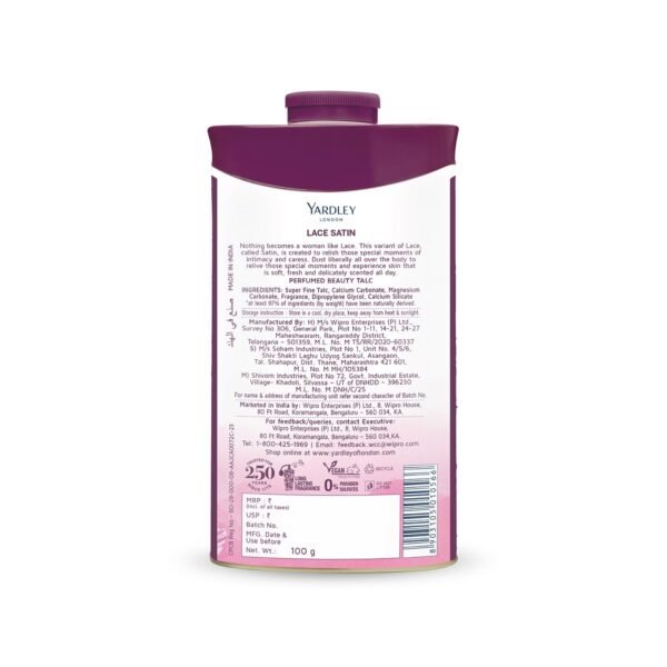 Pamper your skin with the luxurious fragrance of Yardley London Lace & Satin Talc. This 100g talcum powder delivers a soft, elegant scent inspired by delicate lace and smooth satin, keeping your skin fresh, dry, and lightly perfumed all day. Ideal for daily use, it helps absorb moisture, reduces friction, and leaves your skin feeling silky and comfortable.